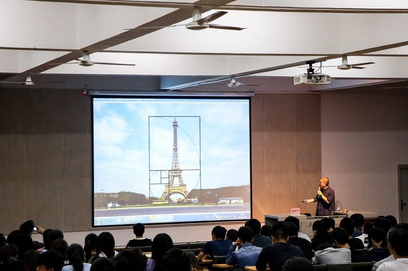 讲座一开始,金剑平教授给大家提出关于设计当中的数理:设计不仅仅是感性的,也存在理性的考量,感性的培养是区分艺术家与非艺术家的一个分水岭。金教授的一番话,让同学们对此次讲座产生了极大的兴趣。金教授以巴特农神庙、金字塔、巴黎圣母院、埃菲尔铁塔等全国有名建筑,为我们讲解设计中的黄金比例1:1.618,提出所有按照黄金分割律设计出来的东西都是美的。金剑平教授还通过酒杯、茶壶、日本酱油瓶等事物为例,讲述生活中的黄金比例,描述感性与理性是相契合的。紧接着后面还提出螺旋线、双曲线是线中贵族,并且为我们展示一系列的线性图片。