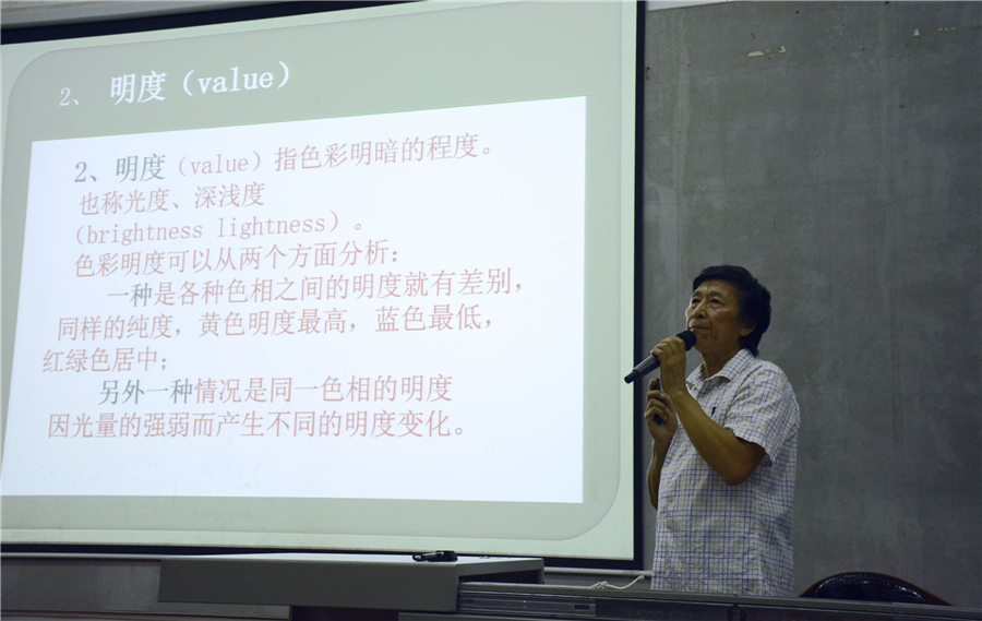 接下来,张玉祥教授以色彩基础的色相、纯度、明度三大要素讲起。张教授以其学生作业为例,其中有的对比强烈,颜色分明;有的柔和多彩,格外优美。让我们感受到了不同色彩的结合所带来的魅力。