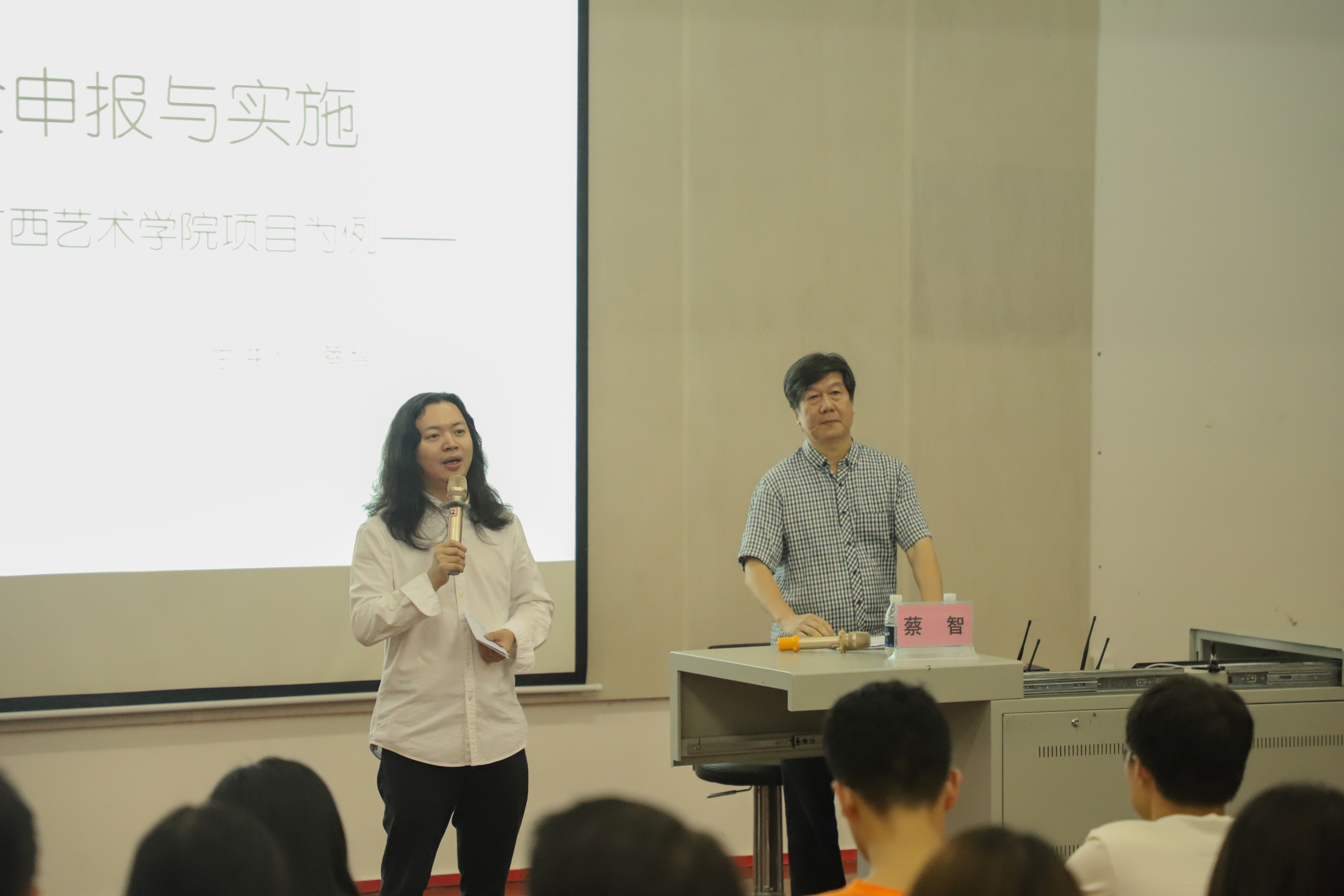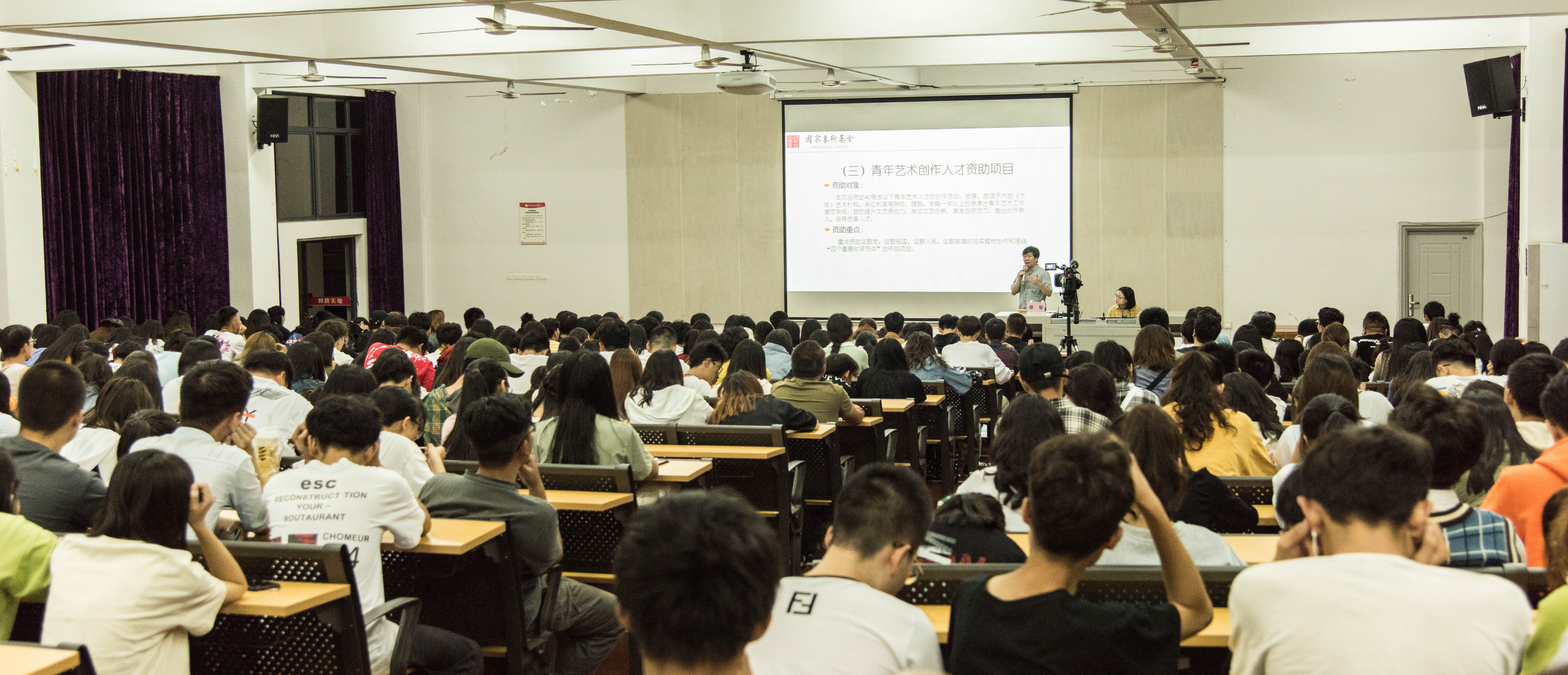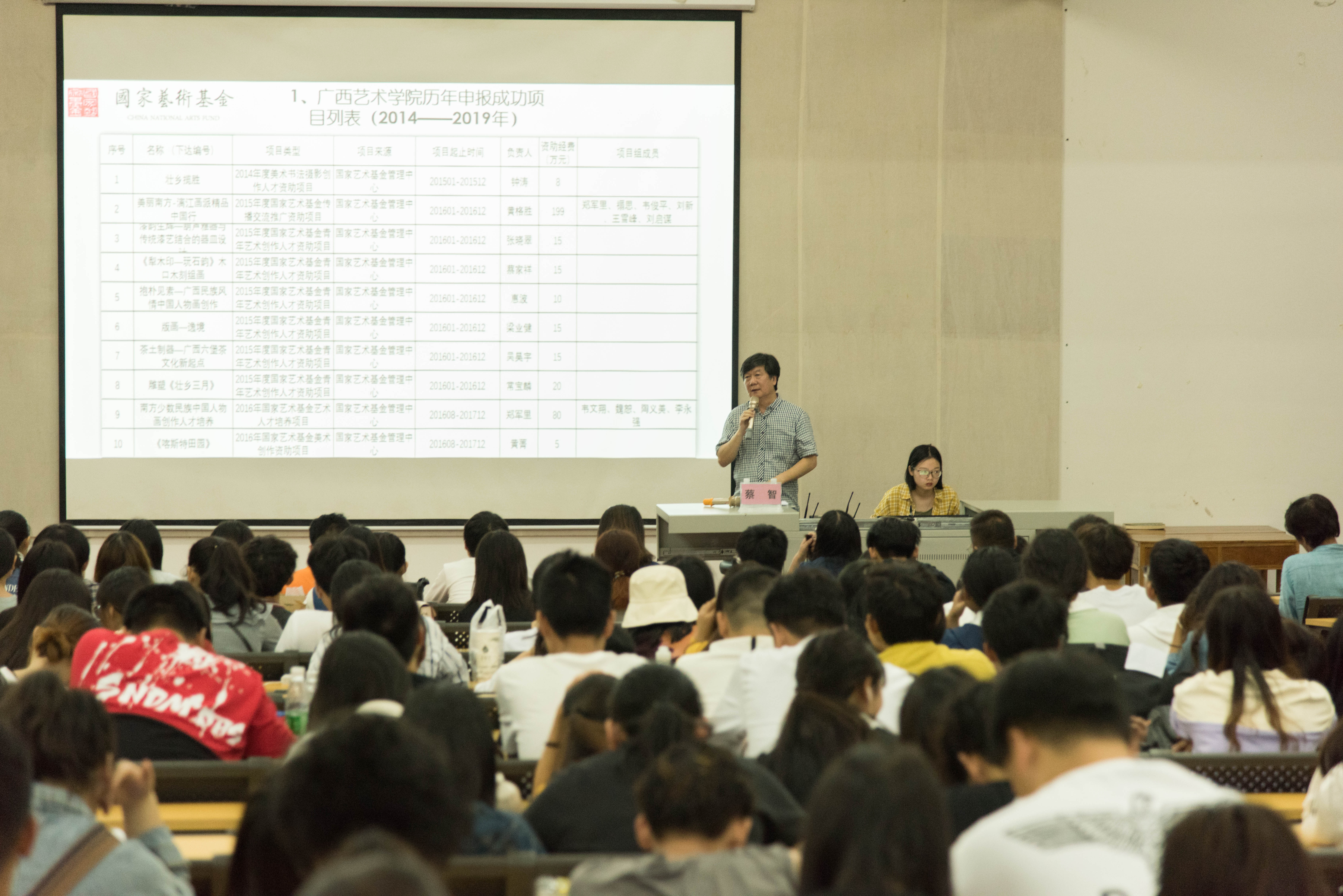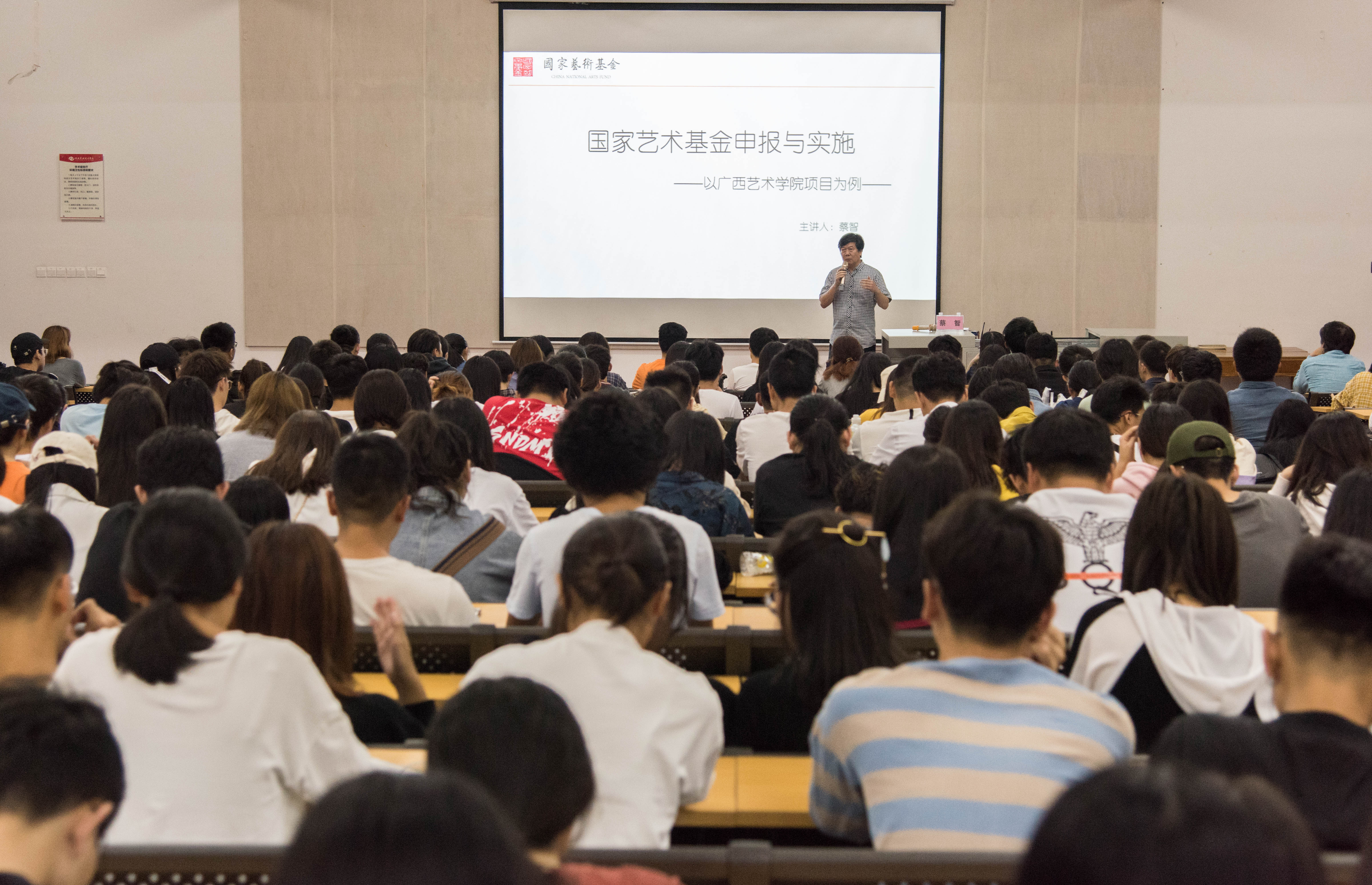 2019年11月16日晚上7:30分于我校西校区伦理楼107,广西艺术学院教授蔡智为我校师生带来一场题为《国家艺术基金申报与实施--以广西艺术学院项目为例》的精彩讲座。现场座无虚席,本次讲座由胡胜副校长主持。